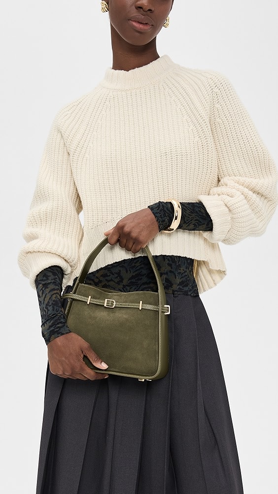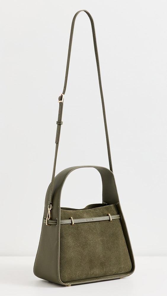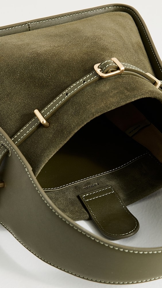 Suede Interior strap with claw clasp closure Open top with magnetic closure Patch interior pocket Shoulder straps Lining: Unlined Weight: 42oz / 1.19kg Imported, Cambodia Style #MADEW47089