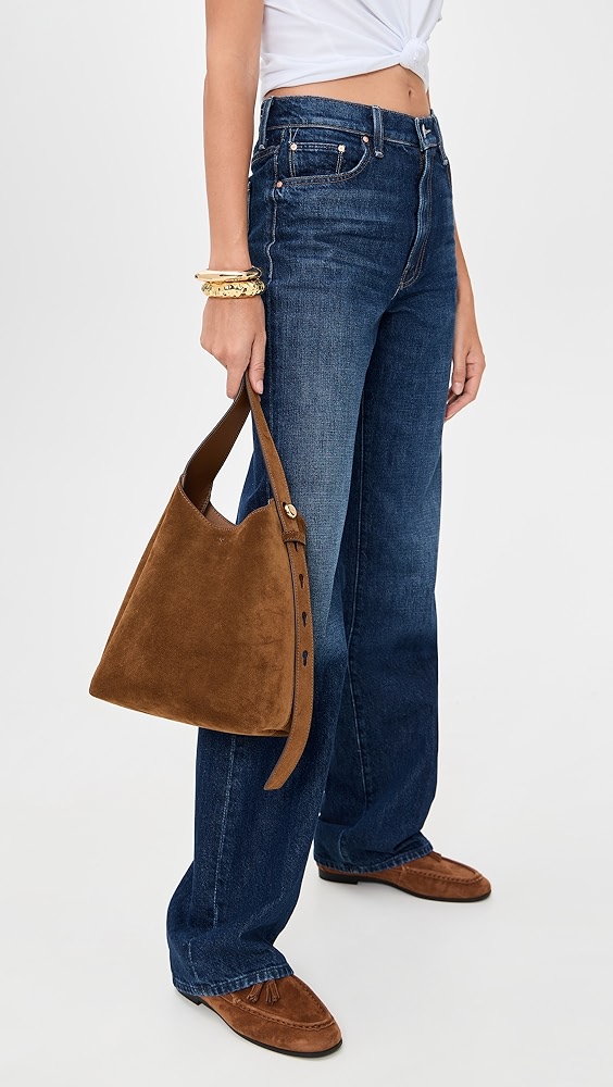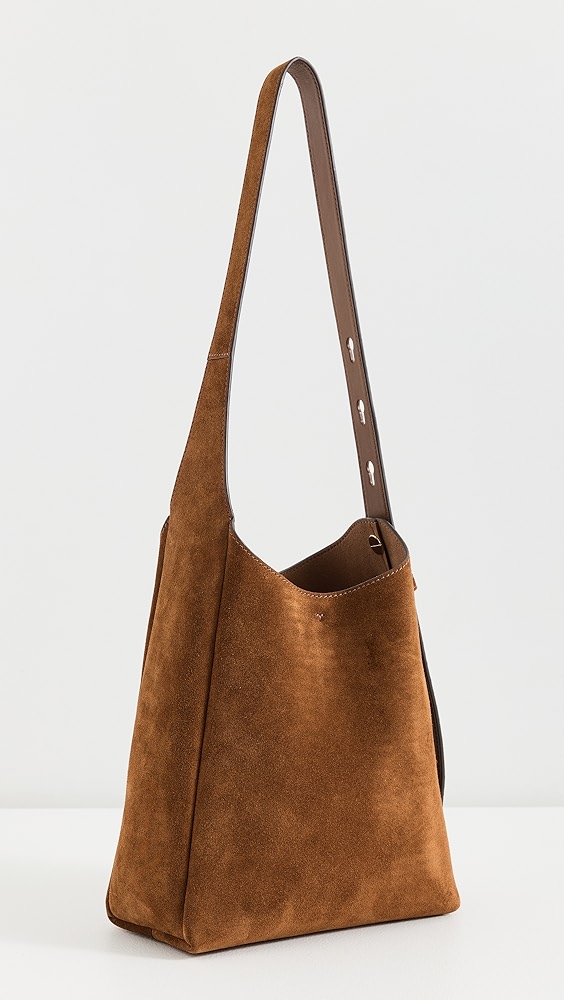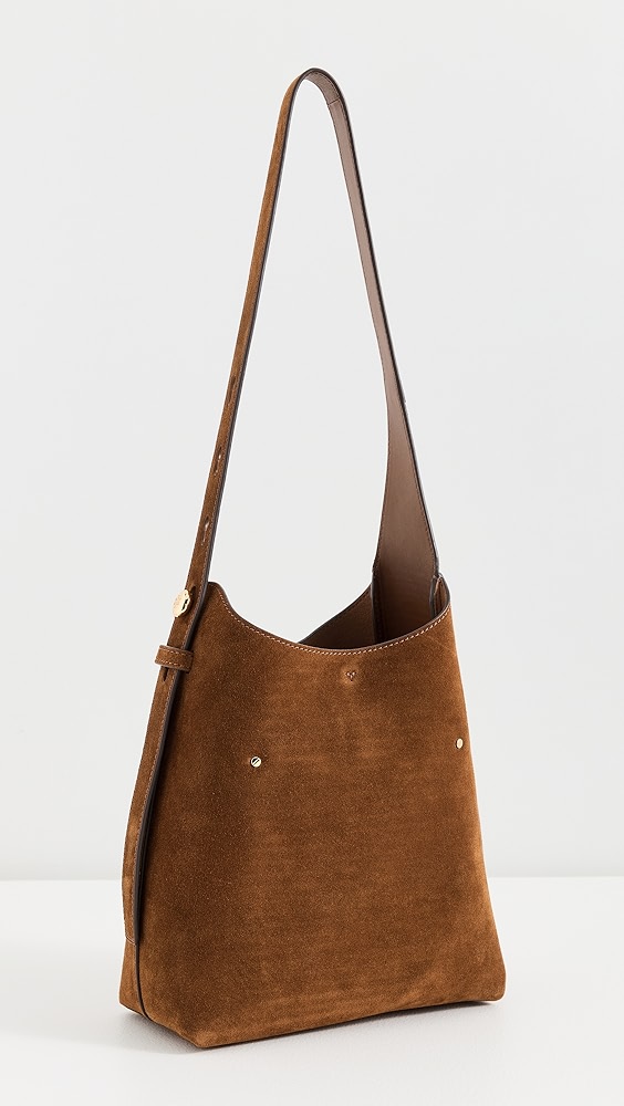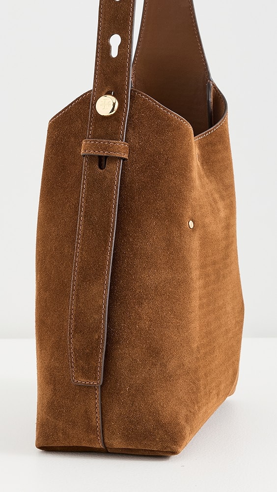 Cowhide suede Expandable sides with interior clasp Open top with magnetic closure Shoulder straps Lining: Unlined Weight: 30oz / 0.85kg Imported, Cambodia Style #MADEW46628